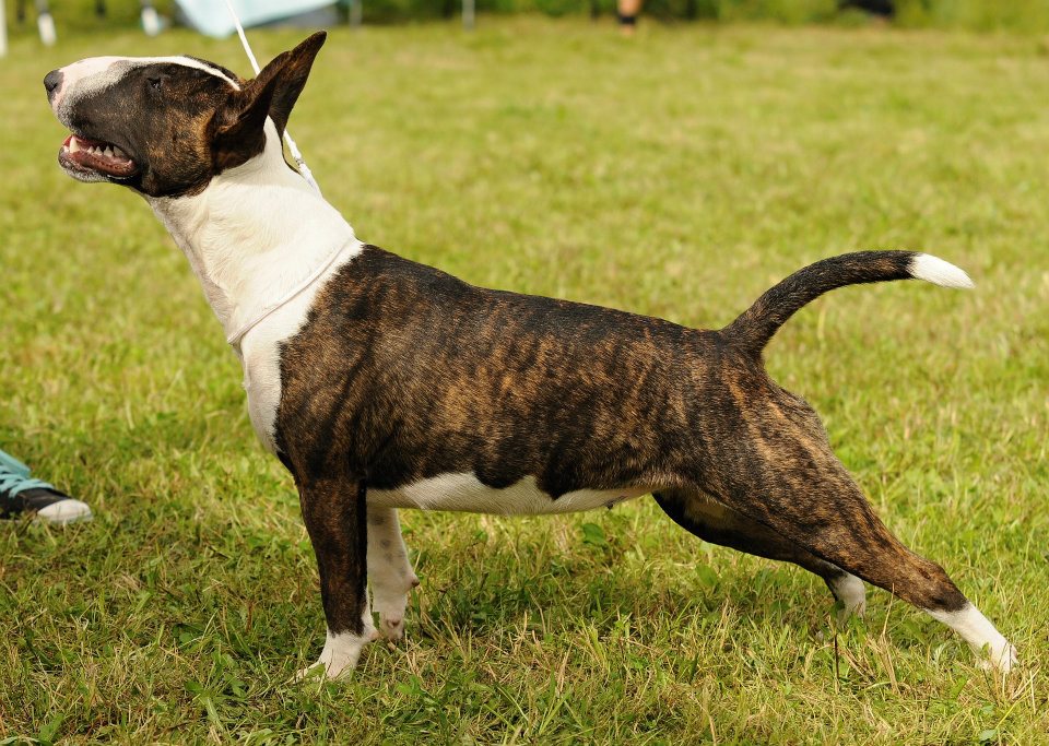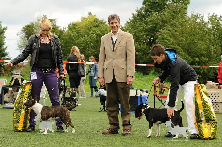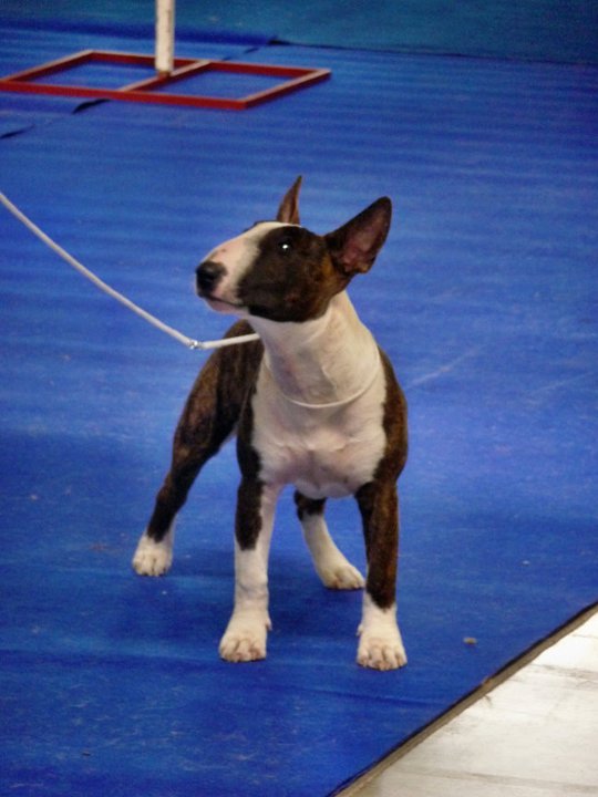 Elegant brindle and white, very good turned profile and finish, excellent lenght of neck to correct shoulder, good topline, movement correct outline, bite correct except one inside canine