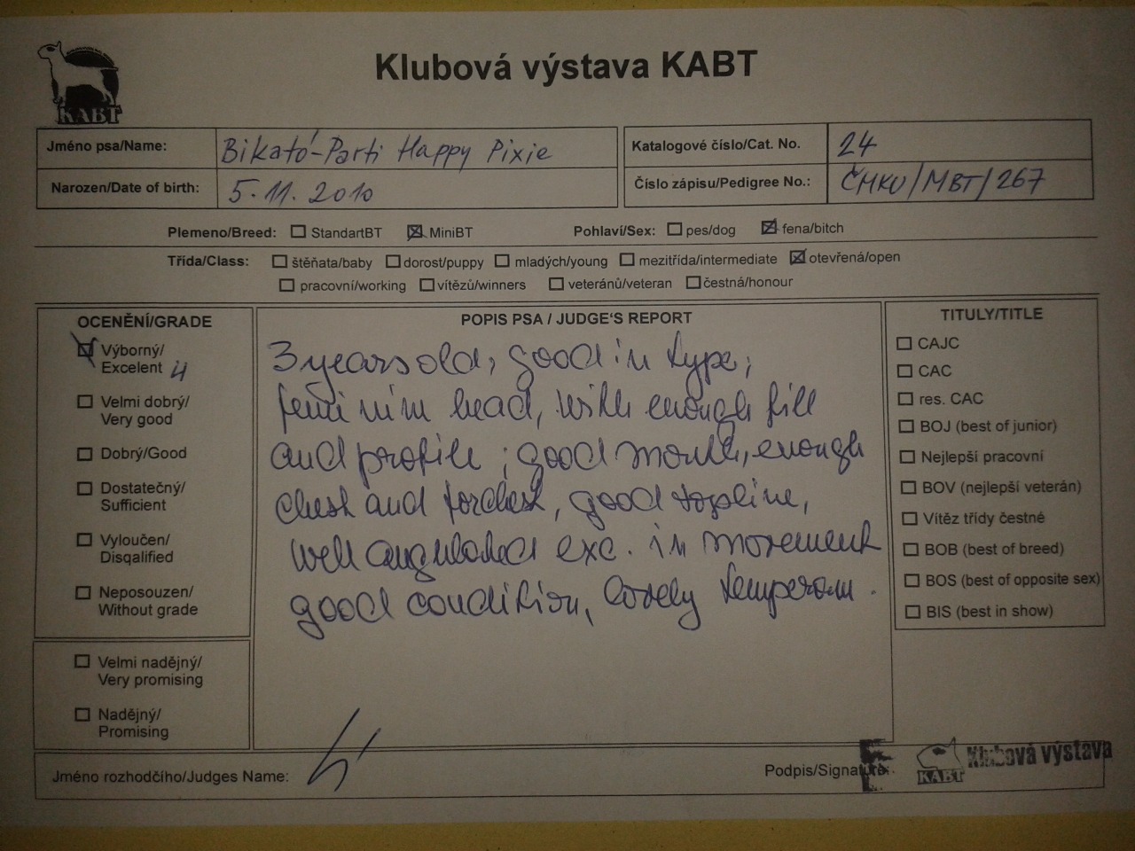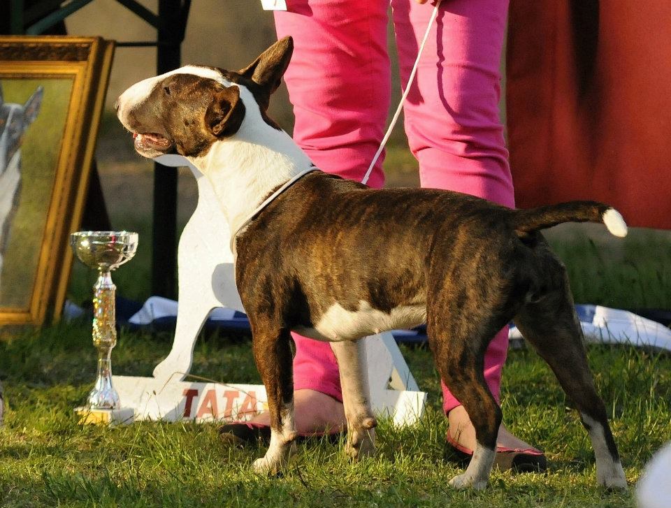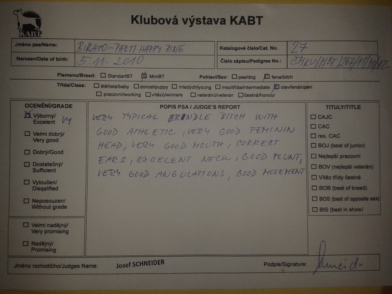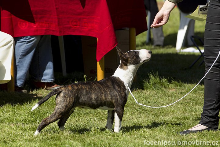 Žíhaná fena s bílími znaky, výborná hlava, oba špičáky zasahují do patra, výborné oko i ucho, pevný hřbet, výborná mechanika pohybu, dobře se předvádí