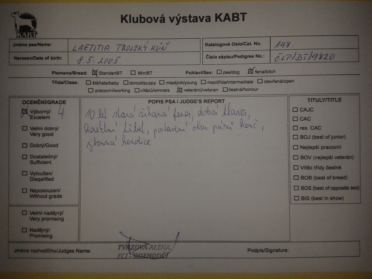Když jsme přišly na řadu, Ticinka byla vzorná, krásně stála, ukázala zoubky, byla milá na pana rozhodčího, chůze perfektní. Pan rozhodčí byl nadšen její kondicí.